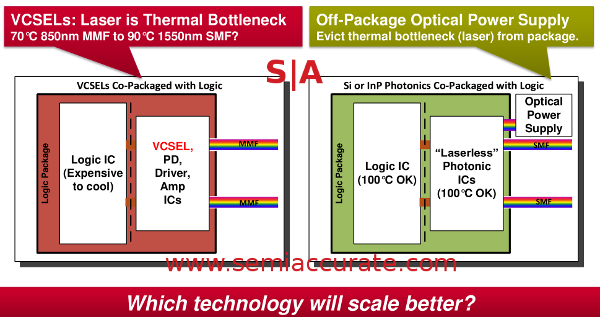 That brings us to the next problem, assuming you are going to put the photonic bits, other than the laser itself on package, how exactly do you do it? VCSEL stands for Vertical Cavity Surface Emitting Laser, and it means what it says, the light goes straight up. This is good in some ways, but bad in others, stacking them being an obvious negative. Other laser types require different mounting solutions that have other problems and benefits. So how do you do it in practice?