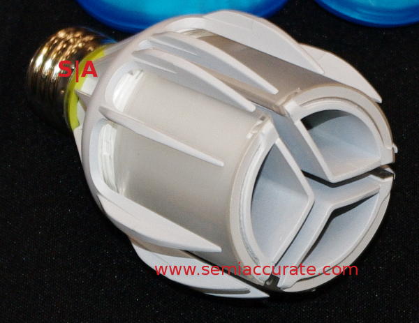 The initial Rambus LED lightbulb is a very highly engineered device with three major advances. The first is a convection design, it pulls cooler air in across the hot LEDs, and then guides them up the side with a chimney effect that also pulls in new cool air. It is designed to work at all angles, so no worries there either. Most of the white bits aren’t actually plastic but metal that works as a heat sink as well as a structural component.