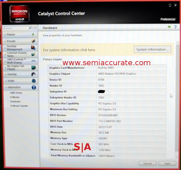 Memory is 3GB of GDDR5, 384 bits wide, and running at the same 5.0GHz as the HD7950. If you don’t want to do the math, that does add up to the 240GBps that the CCC indicates. Core clocks are 925MHz, way up from the 800MHz of the 7950. Turbo will obviously be there, so this 925MHz is just the starting point. As a reference point, the first gen 7970 had the same 925MHz clock and slightly faster memory at 5.5GHz.