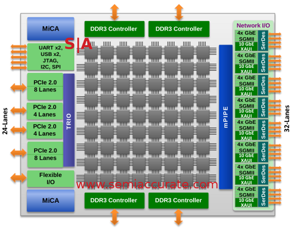 You might notice that the difference between the 36 and 72-core variants can best be described as “2”. The big one has twice the PCIe lanes, twice the ethernet, twice the memory controllers, and so on. It pulls roughly twice the power too, said to be in the 60W range, not bad on such a large chip running at 1.2GHz. For those interested, no die size was given, but it is built on TSMC’s 40nm process and will sample next month.