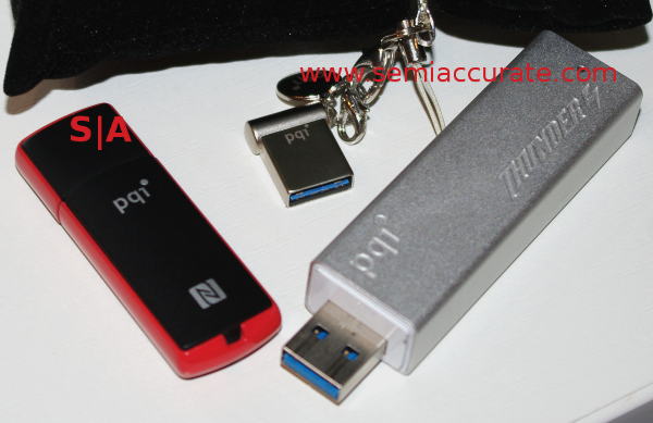 PQI claims that the Thunder IV is the fastest drive out there with 360/340MBps read/write speeds. Unfortunately that number didn’t hold up for long because as the day came to a close the speeds were changed to an official 400MBps read rate. If you look at what percentage of the theoretical USB3 data rate that is, you can see how hard the bus is being pushed. I-Mini on the other hand isn’t very fast, it is a USB3 drive without RAID or multiple channels. This puts it at a small fraction of the Thunder’s speed, but it can pack 16-32GB in that space with a 64GB version very likely coming soon. The Thunder goes up to 256GB and more is undoubtedly coming too.