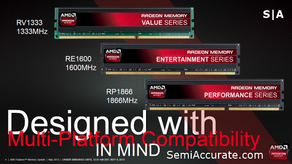 By far the most interesting thing we learned from AMD’s presentation was that all of its memory products, including the RAMDisk software, are being produced by Dataram. What’s even more interesting is that rather than AMD rebadging Dataram’s products for sale, Dataram has licensed AMD’s Radeon brand. This would lead us to believe that as part of the licensing deal AMD is taking care of the product marketing and taking a small cut from every sale of Radeon branded RAM that Dataram sells.