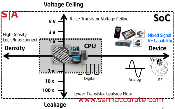 The last part is the non-transistor components that you need to make an SoC. If it isn’t obvious, an SoC process needs to have these components available and P1271 does just that. Most importantly, the 22nm process is said to significantly improve analog performance over the 32, 45, and 65nm processes that preceded it. As you can see from the list above, the components available to the SoC designer is fairly extensive. Speeds, voltages, passives, and memory are there and plentiful enough to keep a fleet of interns or a small shell script busy testing options for an entire summer.