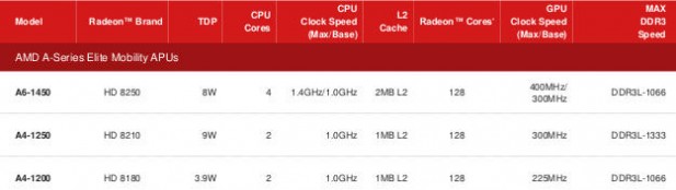 One curious stat is that only the A6-1450, the highest Temash SKU, has a base/max clock speed. The reason for this is something called Turbo Dock, a fancy way of saying they crank the power way up when it is plugged in to the wall. When you dock a tablet or Temash WIAFFNOWBMAIWTHACTSTBITPCM (Widget In A Form Factor No One Wants But Microsoft And Intel Wrongly Think Has A Chance To Stop The Bleeding In The PC Market), can pull up to 2x the power if cooling permits. This gives up to a 40% clock speed increase and refreshingly AMD only claims a 30%+ performance boost. This harkens back to the old days of battery vs wall mode on laptops, but it is still a worthwhile idea today.