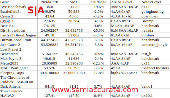 The 16 tests we ran were picked mainly because that is what we had available, not ideal but good enough. The numbers are the GTX 770 at stock clocks followed by the HD7970 GHz Edition. The next column labeled 770 %age is the speed of the 770 as a percentage of the HD7970 GHz Edition. Of the 16 tests runs AMD won 12 and Nvidia 4, but three of those four are pretty ancient and not really representative. Basically we had to go a long way back in the archive to find things that Nvidia is better at in high resolutions. It will be interesting to see where each reviewer tests at.S|A