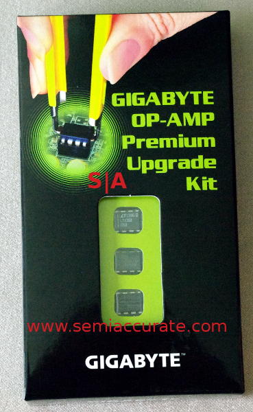 Why would you socket it? How about to swap it out with the other one included in the system for a noticeably different sound. If two op-amp variants are not enough Gigabyte will sell you a kit with three more from Burr-Brown, Linear Technology, and Analog Devices along with a handy chip puller for those not willing to soil their fingers. In total there are five op-amp choices to choose from, and based on the demo at Gigabyte they do offer significantly different sound, and all are noticeably better than the non-op-amp sound output.