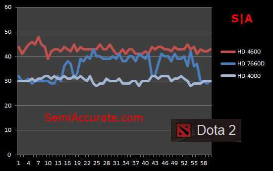 In DOTA 2 the HD 4600 actually manages to take the lead from AMD’s A10 APU. This is an impressive considering the A10’s dominance up to this point.