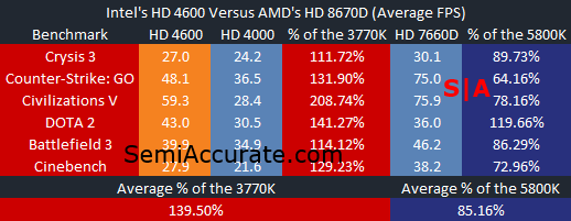Looking at the averages here it’s clear that Haswell’s GT2 represents a significant performance improvement over Intel’s old HD 4000. A 40 percent increase on the same process node is a pretty big jump. But at the same time it’s clear that, at-least on the desktop, AMD’s APUs still have the lead in raw graphics performance.