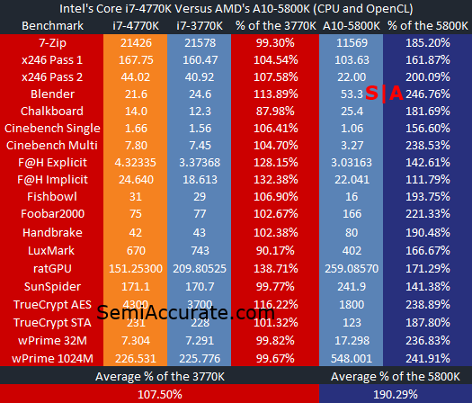 It’s worth noting that the i7-4770K offers basically double the performance of AMD’s A10-5800K, a chip that costs a bit less than half the price. So from that perspective the i7-4770K isn’t really a performance per dollar leader. Granted, I doubt that Intel intended for it to fill that role. There just isn’t a whole lot that i7-4770K offers that the i7-3770K didn’t. Performance is equal or marginally better, the $300 price tag is about the same. The only place where this chip puts any distance between itself and its predecessor is in OpenCL applications.