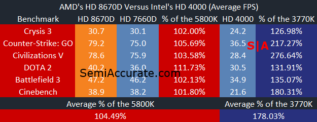 This table of average frame rates demonstrates that much of what we witnessed by looking at our benchmarks individually is visible here in the averages. Richland is marginally faster than Trinity and the 3770K represents a GPU solution that is in a lower performance class.