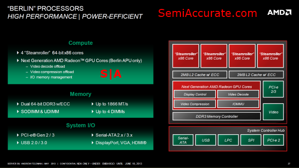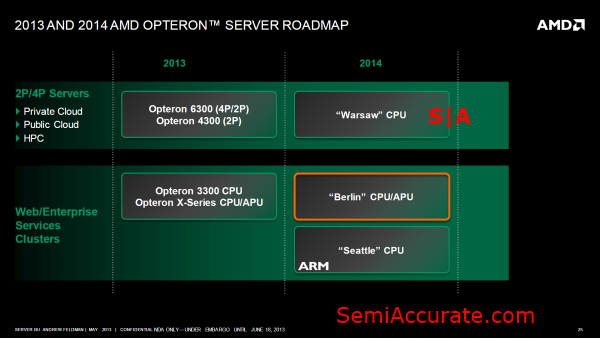 Moving up one tier the product stack AMD’s renewing its assault on the 1P market by leveraging its mainstream APU rather than its high-end server part as it’s done traditionally. A server variant of “Kaveri” named “Berlin” will be targeting this segment, which means that AMD’s unreleased “Steamroller” core will make its first appearance in the server market inside of 1P servers. The 1P market is commonly associated with webhosting and workstations, unfortunately AMD’s “Berlin” won’t be able to compete with Intel’s workstation offerings which are based on the “Ivy Bridge-E” chip that Intel is rumored to release in the near future. But the cost-sensitive webhosting market may prove to be a better fit for “Berlin”.