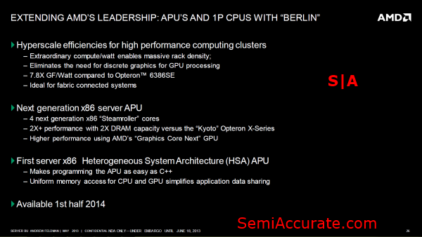 According to AMD the switch from a CPU only architecture to an APU design allows “Berlin” to produce 7.8 times the Gigaflops per watt of a current generation Opteron SE. AMD also expects “Berlin” to offer more than double the performance of “Kyoto” or the Opteron X-Series and 64 gigabytes of memory capacity. But by far the biggest single advantage that “Berlin” has in the server market is full HSA compliance which will allow for uniform memory access between the CPU and GPU portions of the chip and should make programming the chip both easier and more efficient compared to programming non-HSA APUs.