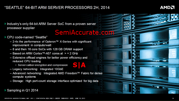 Let’s start with the most interesting product on AMD’s new roadmap, “Seattle”. This is the ARM based server processor that AMD is aiming at the micro-server market and the first product to really demonstrate the company’s ambidextrous strategy. Whereas the current Operton X-Series is a essentially a low-cost consumer APU that offers a few more server specific feature than its consumer brethren “Seattle” is a chip that was designed specifically to attack the server market. This means that some of the IP blocks found on “Kyoto” are being dropped in favor of greater power efficiency and more server-specific IP blocks like an integrated ten gigabit Ethernet controller and what AMD calls a, “High port-count storage interface optimized for big data.”