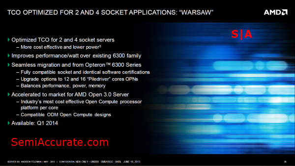 The final product on AMD’s roadmap is “Warsaw” a twelve to sixteen core CPU, based off of AMD’s “Piledriver” core. It’s hard to have much hope for “Warsaw” as it’s a simple refresh of AMD’s current Opteron 6300 series chips which have been unable to stop AMD from bleeding server market share. “Warsaw” will be produced on Global Foundries 32nm process, offered in 2P and 4P configurations, and is compatible with AMD’s socket G34. In my chat with Mr. Feldman he seemed confident in AMD’s ability to make “Warsaw” a worthwhile refresh from AMD current “Abu Dubai” chips, by citing a focus on increasing efficiency. “Warsaw” will be similar to “Richland” in the sense that it takes advantage of process improvements to increase based clock speeds, and more aggressive power management to reduce consumption and offer higher TurboBoost clocks.