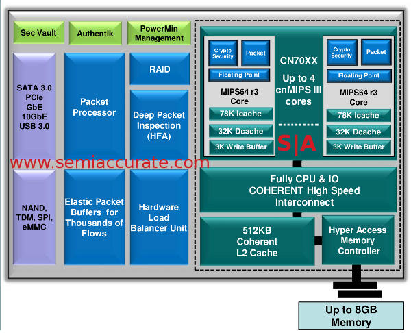 The packet processor and RAID blocks are just what they seem, TCP/IP offload and packet processing for network oriented versions of the CN70xx chips and hardware RAID for NAS oriented versions. Both are improved over the older versions and while indispensable are not exactly new or exciting. Think of these as functional necessities for any SoC in this class. Also do note that each MIPS core has it’s own dedicated packet processing block in addition to the SoC version.