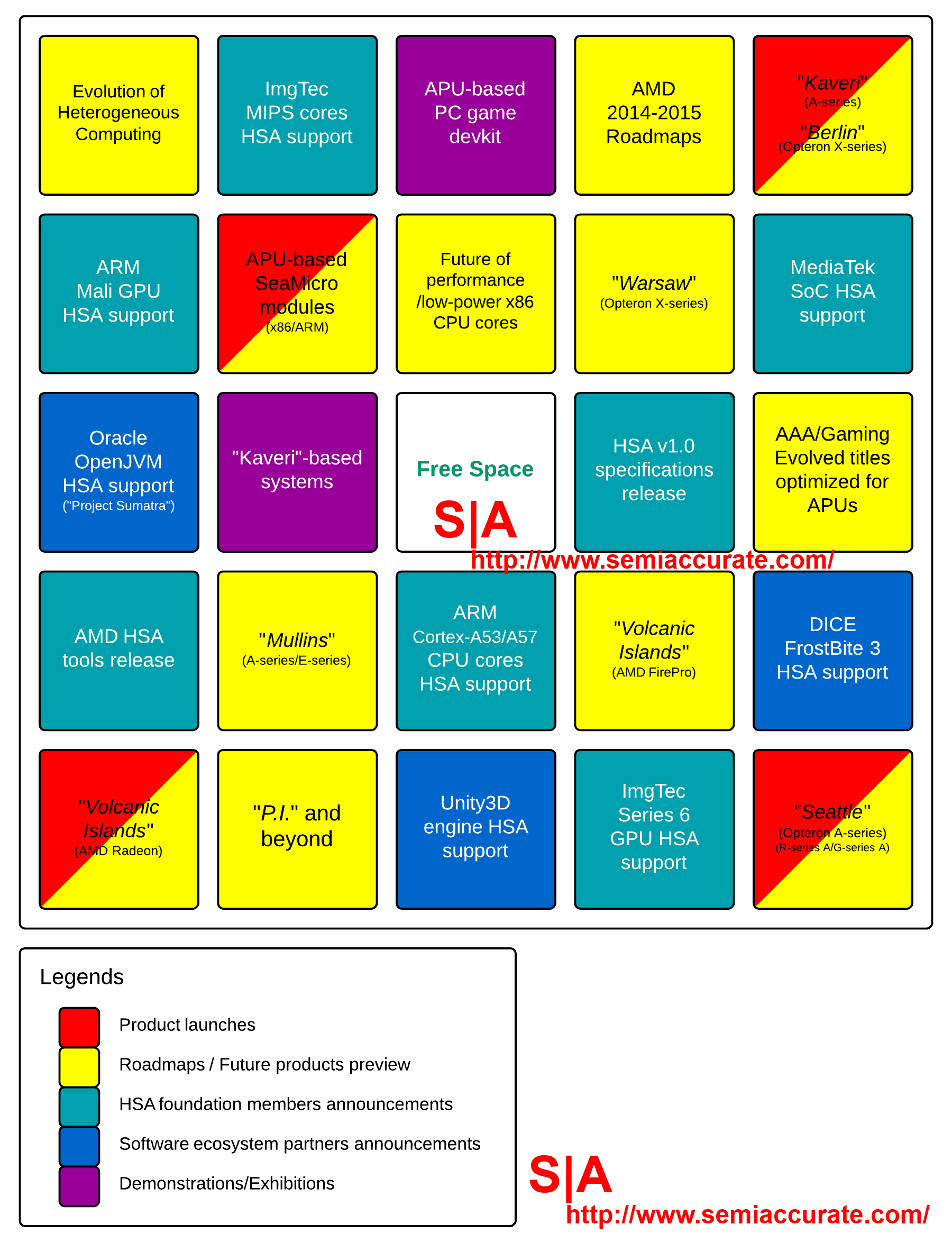 And here, we take the liberty to join some of the dots for you, our readers. The major milestone for the HSA Foundation would be the release of the first official HSA specifications. As the first HSA specification (v0.95) [PDF file] was put online May 29, 2013, with the version 1.0 specification already in the working group for ratification, this is a very likely announcement this year, probably alongside a series of announcements of supporting HSA specifications on current or very near-term hardware from the three HSA Foundation founding members, ARM, Imagination Technologies and MediaTek. These include the Cortex-A50 series (A53/A57), the Mali GPU, the Imagination Technologies PowerVR graphics and their MIPS cores, and smartphone SoCs from MediaTek.