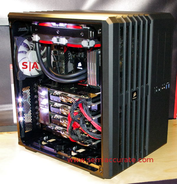 The first thing you saw when you walked in to the Corsair suite is a big case, and we mean really big case. The monster below is called the Carbide Air 540, and if it looks like two mini-tower cases welded together side by side that is mainly because this is what the 540 is. The left side is for the mobo and all things directly mounted to it, and the front has massive fan mountings where drives normally go. The rear is also fan mount heavy so there is a straight airflow path over the high wattage components.