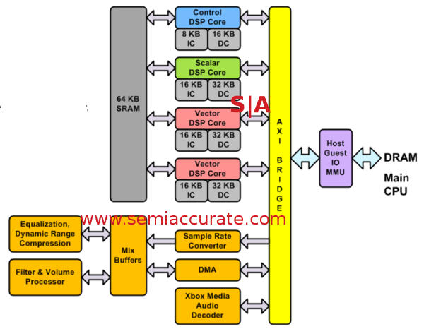 This whole unit was an internal Microsoft design rather than an off the shelf IP block. Since the Kinnect uses the DSPs heavily for positioning sound this makes sense, especially considering the coherency requirements with the rest of the system components. One notable absence however is specific ties to the PCIe, coherent DMA<->GPU links, and other I/Os listed in the system diagram earlier.