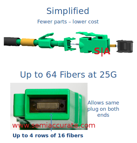 The connector itself is a pretty massive step forward as well starting with 64 lanes vs the 24 on MTP. MTP also had bare fiber to fiber connections that were only 50 microns wide. Tolerances are tight and tolerance stacking problems meant that you had to be pretty darned precise to get things to work right. Too close and you could scratch or chip the other end, too far and you would lose too much energy. It was a pain to use. Worse yet any dust or fingerprints on the exposed connectors meant a bad connection, and 50 micron dust is pretty common in most places.