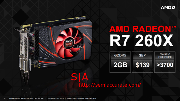 Starting from the bottom of the new stack we have the R7 250. This card looks to be a direct replacement for the HD 7750 at the $89 price point. It hard to say exactly what chip is in the R7 250, but judging by its price point and performance level is this probably a new version of the Oland chip that debuted last year in AMD’s OEM and mobile HD 8000 line-ups. Oland was notably more efficient than the other GCN GPUs in terms of performance per watt by some reports and as AMD’s APUs have grown in performance there has been less and less reason for the company to focus its efforts on the sub-$100 market. Additionally for the last two generations AMD has taken its bottom-end mid-range cards and send them down to do battle in the low-end with the next generation. Thus it seems like there’s a reasonable chance that Oland is what drives this R7 card.