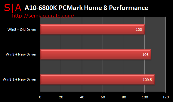 AMD published a new blog post coinciding with the launch of Windows 8.1 detailing a significant performance increase for Richland-based systems running on Windows 8.1. AMD’s September update to Windows 8 video driver for APUs resulted in a six percent increase in performance in the PCMark 8 home test on an A10-6800K APU, a model which we reviewed in June. Using the same driver and platform with Windows 8.1 AMD’s internal testing showed a nine-point-five percent uplift over the old driver running on Windows 8. Considering that AMD’s new driver was responsible for six percent of that uplift, it appears that whatever Microsoft has done in Windows 8.1 has boosted the performance of AMD’s APU by just under five percent in this particular benchmark.