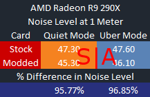 Right off the bat we can see a small reduction in noise output from the R9 290X. Admittedly the difference is minimal, but these figures don’t really do the change justice because the tonality of the noise coming R9 290X changes from a slight wine at stock to just the sound of air whooshing by with this mod. Subjectively the noise coming from the 290X was lower in volume and more pleasant on our modded 290X.