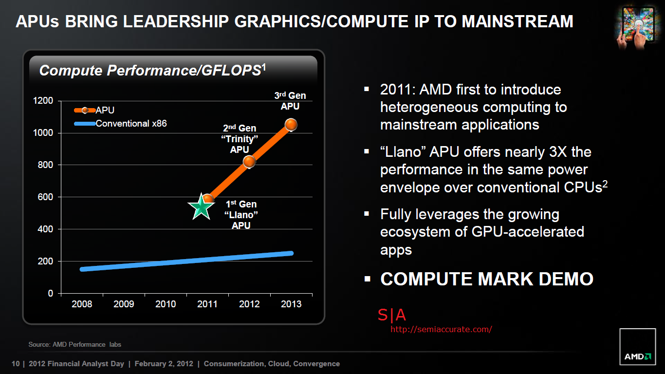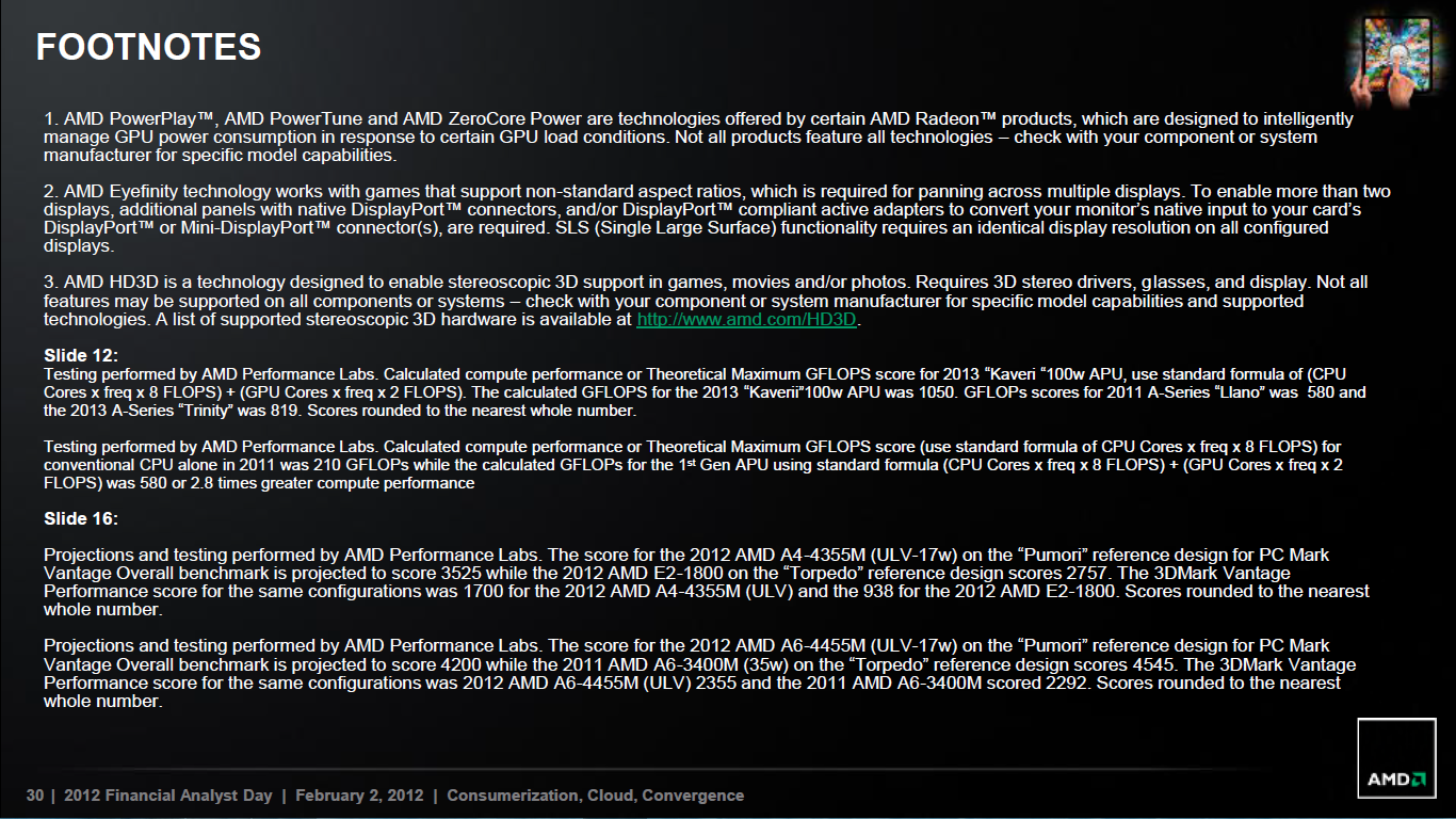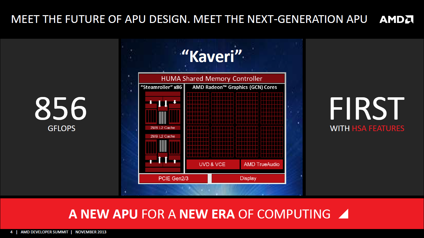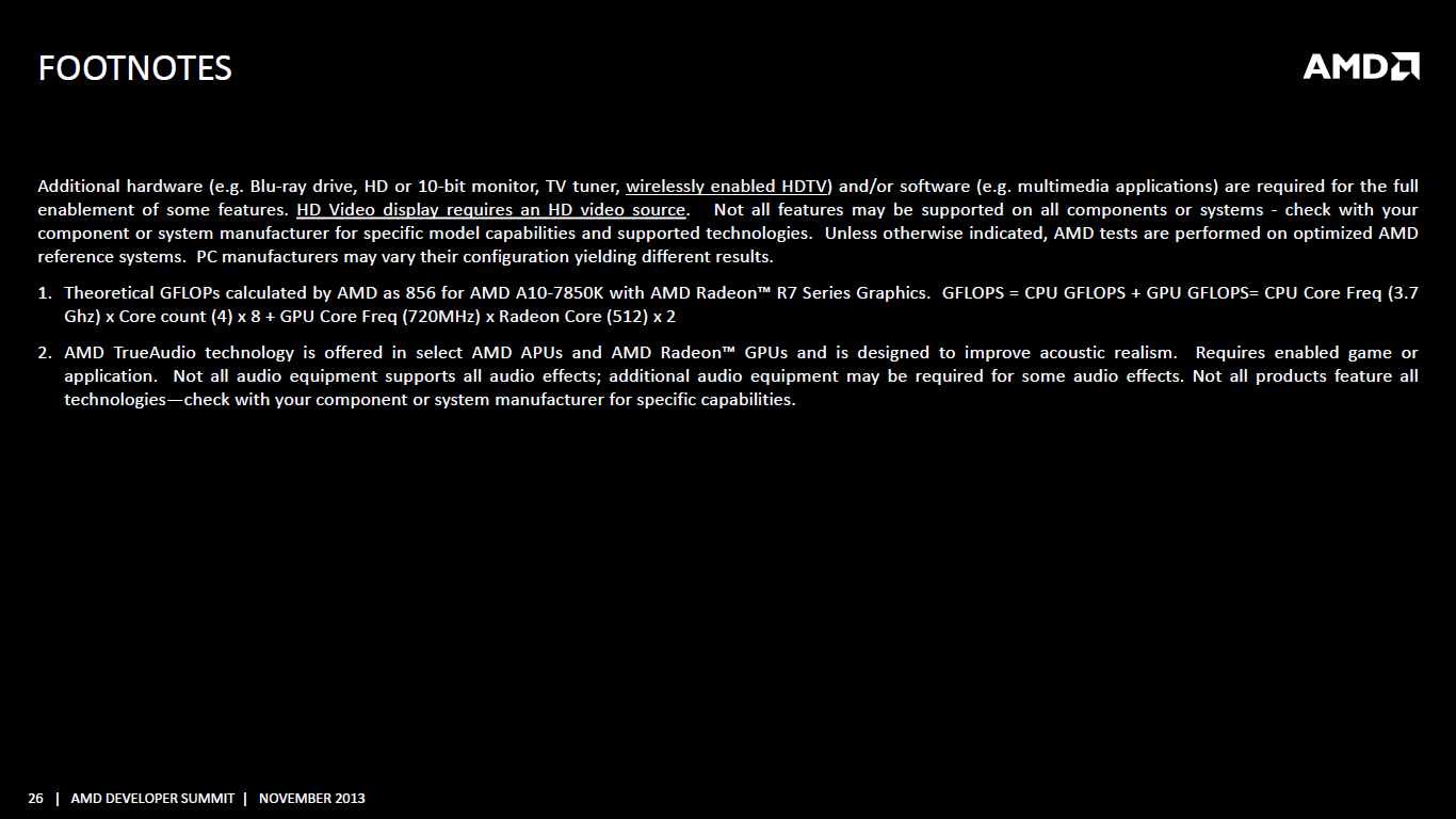 It looks like AMD’s missed the mark big-time with its upcoming mainstream APU, codenamed Kaveri. In Lisa Su’s keynote on Monday the company announced that the highest performance version of Kaveri will be good for 856 GFlop/s. This information is stark in its contrast to 1050 GFlop/s number that AMD announced for Kaveri at its 2012 Financial analyst day.
