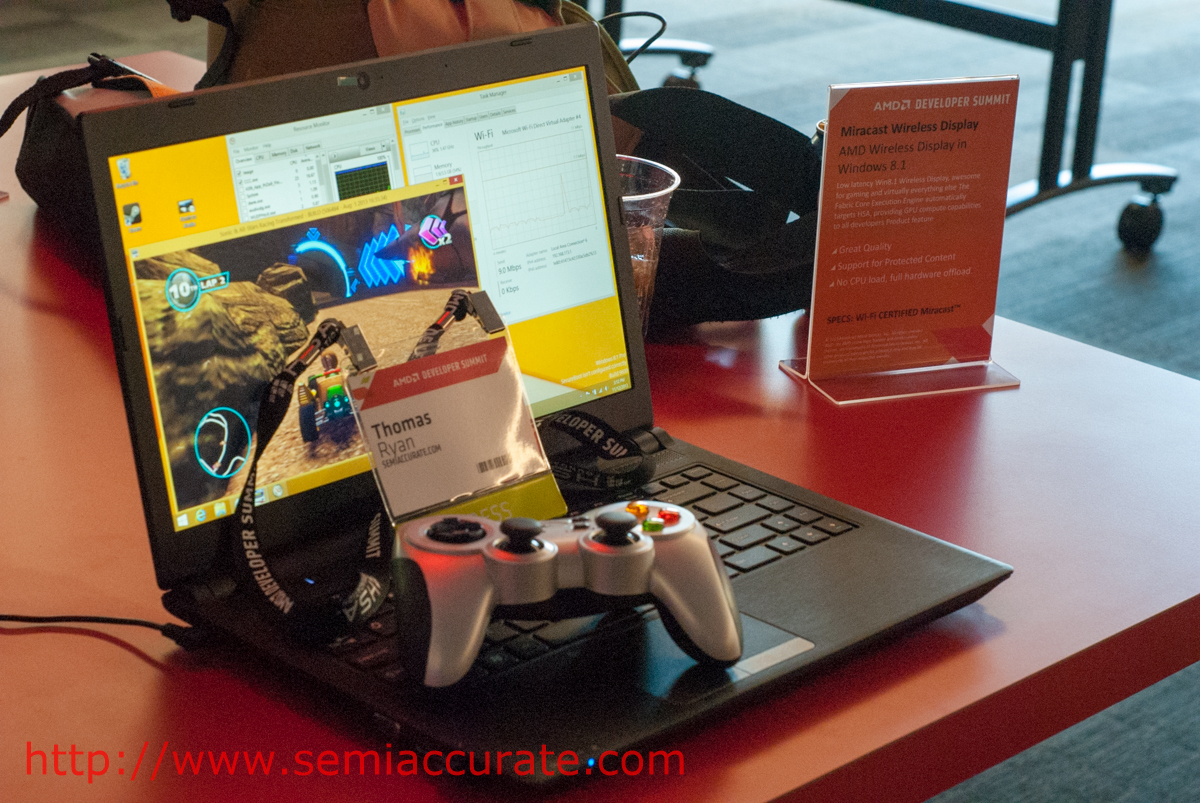 Stashed away at a booth in the experience zone of AMD’s Developer Conference was a demo of the company’s wireless display technology. AMD’s Daryl Sartain was happy to give us a complete run down of the solution that AMD’s cooked up. There are three big concerns with any wireless display implementation: latency, system overhead, and ease of use. AMD has nailed all three of these items and video games are actually playable to boot.