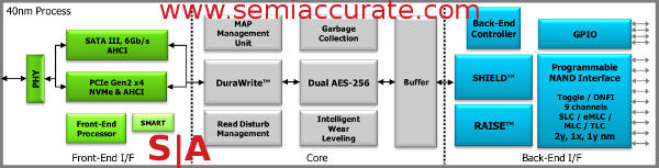 We asked LSI about this and they confirmed it was area that could be saved with multiple dies but doing it with one saves OEMs significant validation and firmware coding expenses. Ironically the one die, even with the unused area ends up being a net cost win for everyone even if it is counterintuitive. For the record the SF3700 is built on a 40nm process. The scalable part of the SF3759 was not explained but we will drag it out of them later this week at AIS, our bet is you can gang them to fake a wider interface.