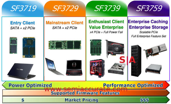 As far as products go there are four new sub-lines, each from the same ASIC. The low-end SF3719 supports SATA or PCIe2x and has the smallest feature set. Up one model to the SF3729 gets you a few more features but no big changes, both of these models are aimed at laptops and portable devices. The SF3739 ups the ante to PCIe 4x and adds “full power fail” aka a supercap or battery backup which takes it out of the running for the mobile space. SF3749 is the top end which has a “full enterprise feature set” and scalable PCIe so it is aimed at the datacenter crowd.