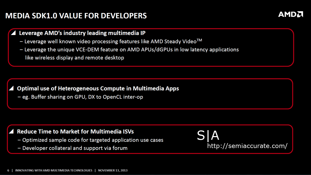 AMD’s Media SDK is about making it as easy as possible for developers to leverage the power of AMD’s heterogeneous platform in applications that transform, transmit, display, or capture video. Whether that means using fixed function hardware blocks, GPU compute, or even CPU cores AMD is leveraging the full power of its heterogeneous platform with the Media SDK to differentiate itself from Intel and Nvidia.