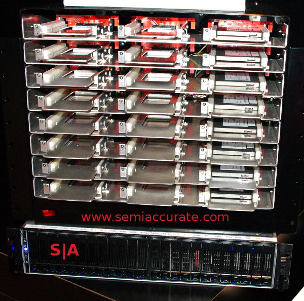 If this tester looks like a 24-bay hot plug backplane for 3.5/2.5/1.8″ drives with a massive DAS box stuck on the bottom to feed it all, well that is about right. There is also a small PC on one side driving the tests and showing results but the hard part is the rig and feeding it, not to mention the software. The simple looking backplane/rack is not at all simple, it is hot plug plus it can cycle power to individual bays automatically for cold retention tests and measure power used too.