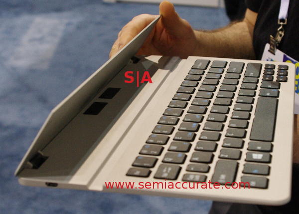 On a similar note you might recall the Thintouch keyboard from Synaptics briefings past, it is a nice feeling part that has both decent travel and a low Z-height. This is done mainly through angling the direction of travel and it works quite well. At CES, Synaptics threw another curve-ball at the technology with the hinged prototype below. When you shut the lid the keys recess to an almost flat surface so the clamshell can be that much thinner. It is a really slick idea.