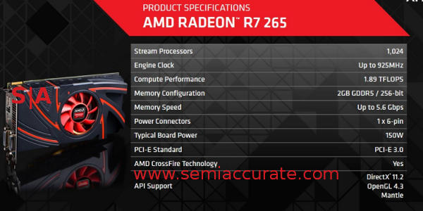 So what’s to like about the Radeon R7 265? Not much really which probably explains why AMD didn’t brief on this or get anyone cards in time to test before release. The R7 265 appears pointless, while likely a bit faster than 260X it is otherwise a regression from it’s predecessor. This probably explains why AMD only showed a single synthetic benchmark, Firestrike, to promote this card. Unless the independent benchmarks show a very different story from what the specs indicate, there is no way the 265 will live up to the claimed 25% performance increase on anything but cherry-picked memory bound benchmarks. The timing of review samples strongly suggest that we aren’t wrong here so you would be best off avoiding the R7 265.S|A
