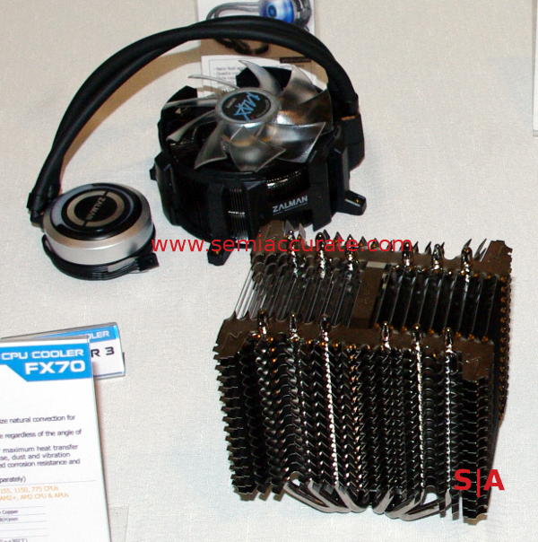 First up is one of the two things Zalman is known for, heat sinks. This new one is called the FX70 and it uses wavy bent fins throughout the design. The idea is to aid convection across the black anodized fins enough to work without fans. Six copper heat pipes should be enough to stay passive with a low power CPU but anything more will requite active cooling. The FX70 supports up to two 120mm fans if you want to add them on.