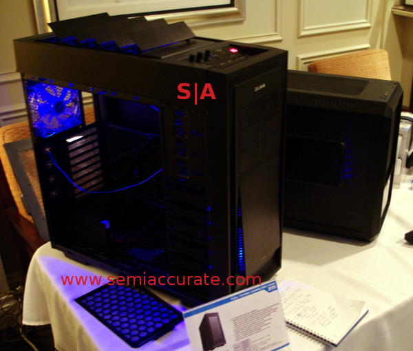 Last up is something pretty unique, the Zalman Z15 full tower case. Given who made it, you can probably understand that it is pretty solidly built, the interesting parts are the vents. The front panel hinges open to allow more airflow in, and the top has louvers to vent air out. The front panel is hand-operated but the top is automatic.