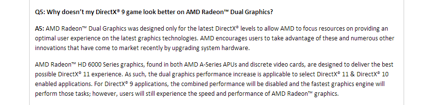 Despite this latest improvement there are still a number of issues with AMD’s Dual Graphics, namely sketchy support for certain AAA titles and the lack of consistent support for titles that don’t use DirectX 10 or 11 for rendering. This means that all OpenGL and most DirectX 9 and below games are not supported by Dual Graphics. Only the dGPU will render those titles. Considering that a large number of popular games, including just about anything from Valve or indie titles like Minecraft don’t use DirectX 10 or 11 the scope of applications for AMD’s Dual Graphics is more limited than the average user might, at first, be led to believe.