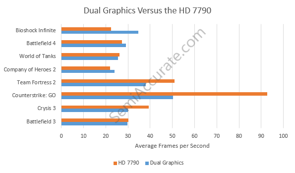 Now let’s look at how Dual Graphics stacks up against the HD 7790 which is very similar in performance to current R7 260(x) offerings that only costs between $10 and $30 more than the R7 250 you’d have to purchase to enable Dual Graphics.