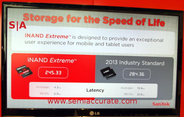 The first new bit is the iNAND Extreme embedded SSD, something SemiAccurate first showed you over three years ago. The iNAND is a phone and tablet oriented SATA SSD, effectively an SSD on a chip. Now upgraded to Extreme status at Sandisk, the new device is an e.MMC 5.0 compatible chip with up to 300/80MBps R/W speeds. Raw speeds for such devices tend to be limited by the interface so Sandisk focused elsewhere.