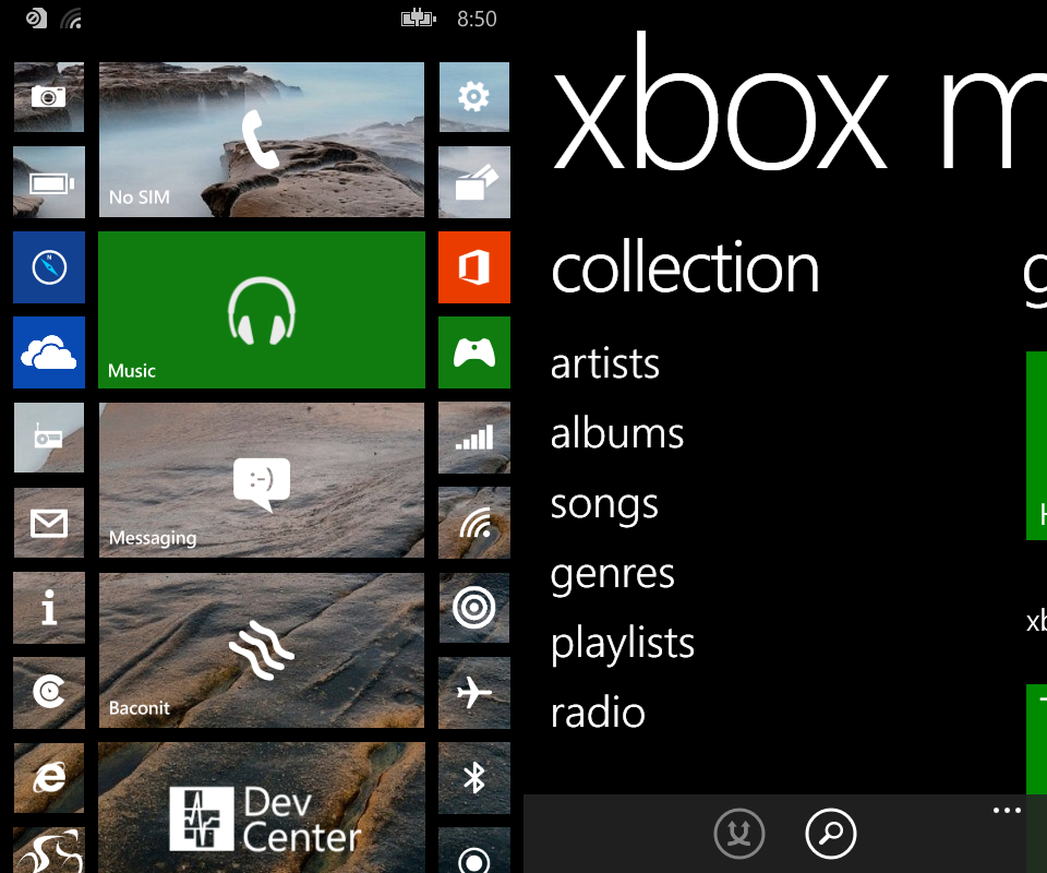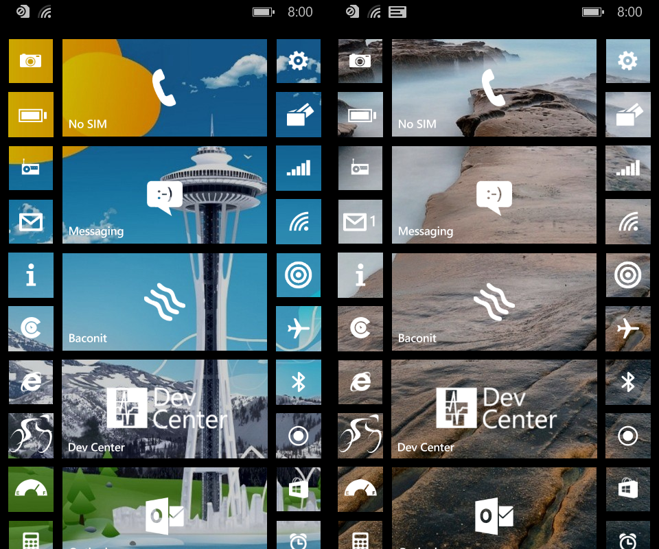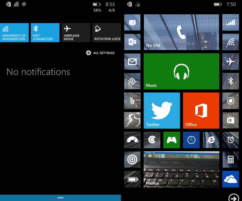 The next most apparent change is another concession to other mobile OSes in form of always visible battery, signal, background apps, and time icons at the top of the start screen. Prior to Windows Phone 8.1 those icons would appear briefly when the user navigated to the start screen and the auto hide themselves after a moment. To see them again you had to swipe down from the top of the screen. I don’t really look at this a positive or negative change, rather it’s a net neutral. Having those Icons visible all the time does increase the visual clutter on the start screen. But at the same time there is something to be said for saving users a swipe to look at how many bars of cell service they have.
