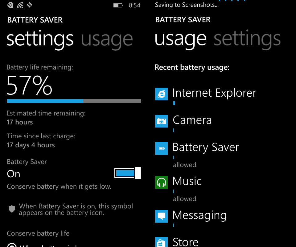 The new battery saver app does exactly what you’d expect it to do by showing all of your apps and organizing them by the amount of battery life they’ve consumed since your phone’s last soft reset. The first tab shows that per app data and then the settings page dives into your current battery percentage and estimates about how long your battery will last. In addition you can configure when your phone will go into power saving mode. Over all this app is a big improvement and a highly useful addition to the Windows Phone platform.