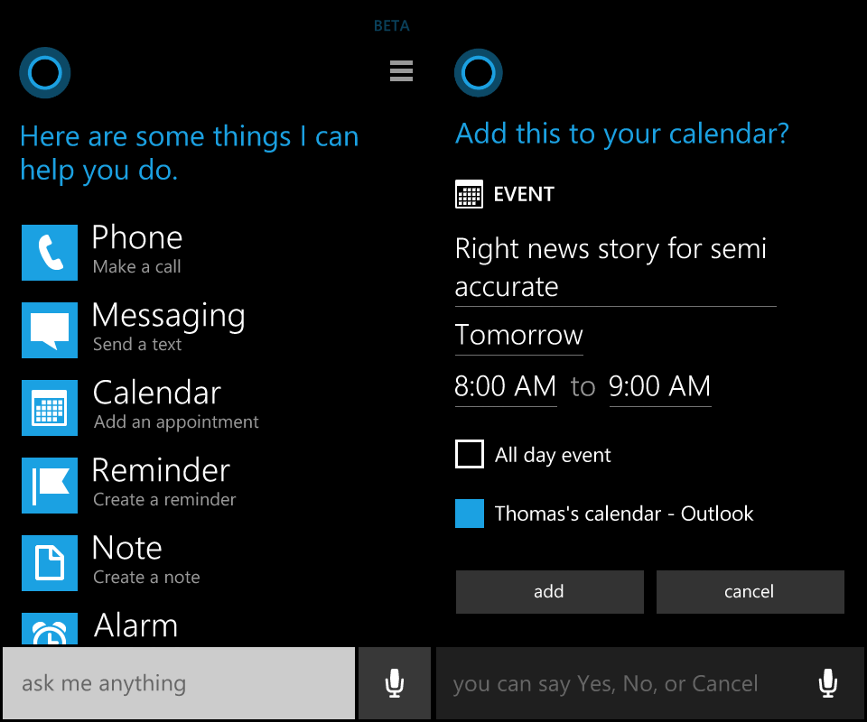It’s important to remember that Cortana is still in beta. That said in my testing I found that Microsoft’s text-to-speech algorithm is actually pretty good. The voices and some of Cortana’s responses don’t sound quite right. But I have no doubt that Microsoft will have that squared away by the time that Cortana comes out of beta.