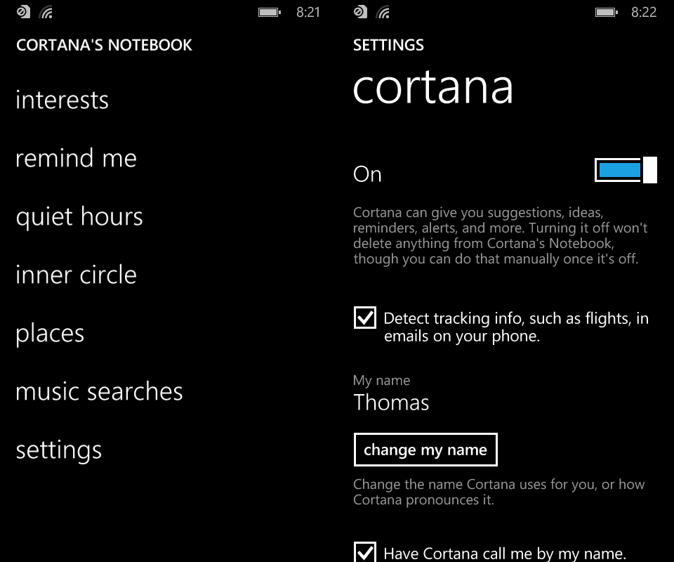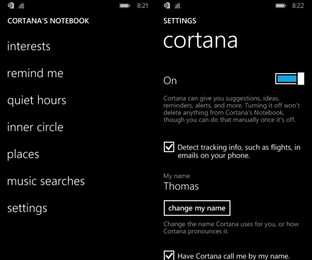 The other interesting aspect of Cortana is that unlike Google Now which by design goes through your contacts, emails, GPS locations, and other data to provide you with relevant information Cortana asks the user if it’s okay for it to look through your data and then offers you the ability to edit what it knows about you thanks to Cortana’s Notebook. Inside of the notebook you can control what Cortana tracks about you and to a degree how it uses that information when it interacts with you.