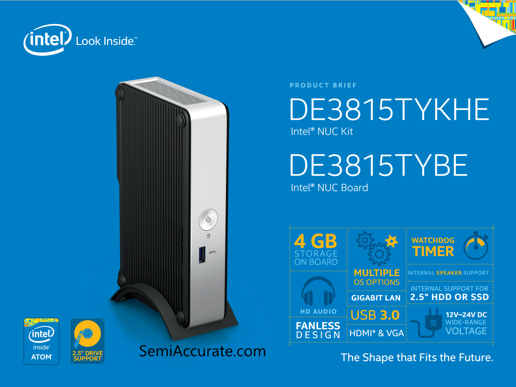 Today Intel is announcing the availability of its first real Atom-based barebones NUC kit, the DE3815TYKHE. Despite having a name that looks like it came out of a malfunctioning random string generator this little NUC is actually a bit of a milestone for Intel. Until now Intel’s NUC offerings had been powered mostly by ultra-low voltage versions of its mainstream desktop chips like Ivy Bridge and Haswell. But now there’s finally a relevant Bay Trail version of Intel’s NUC. (We’re ignoring this over priced NUC from the beginning of this year.)