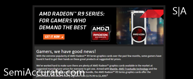 According to a promotional email sent out to the public AMD has been hard at work increasing the supply of Radeon R9 Series GPUs to the point where their current pricing matches up with AMD’s MSRP pricing. Due to a combination of restricted supply, excellent value, and the crypto-currency mining craze the post launch day prices of AMD R9 290 and R9 290X far exceeded the their MSRP’s of $399 and $549 respectively. This pricing madness culminated in a landmark article in February from Anandtech’s Ryan Smith; noting that the Maxwell was green, Skylake was blue, and that the R9 290X was priced at $899 on Newegg.