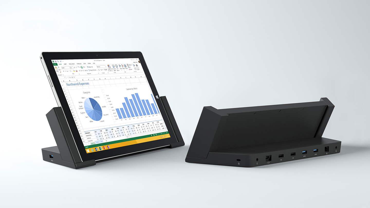 There’s also the new kick stand. The first generation had a kick stand with one open position, the second generation has two open positions, and the third generation is a full-friction kick stand allowing you to place it at whatever angle you want from 0 to ~150 degrees. Additionally there’s a docking station for turning your laptop replacement into a desktop replace when you need more USB ports or display outputs. As docking stations go the Surface one is rather svelte, but this is an option aimed mostly at corporate users rather than mainstream consumers.