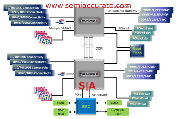 If those specs aren’t enough for you, Thunder X supports 2S configurations via CPI, also known as Cavium Processor Interconnect. You can coherently connect two Thunders for double the above specs, 96 cores, 512GB, 48 PCIe3 lanes, and all the rest. That makes a pretty impressive system if you think about it, per-core performance isn’t that impressive but per-socket throughput is simply massive.
