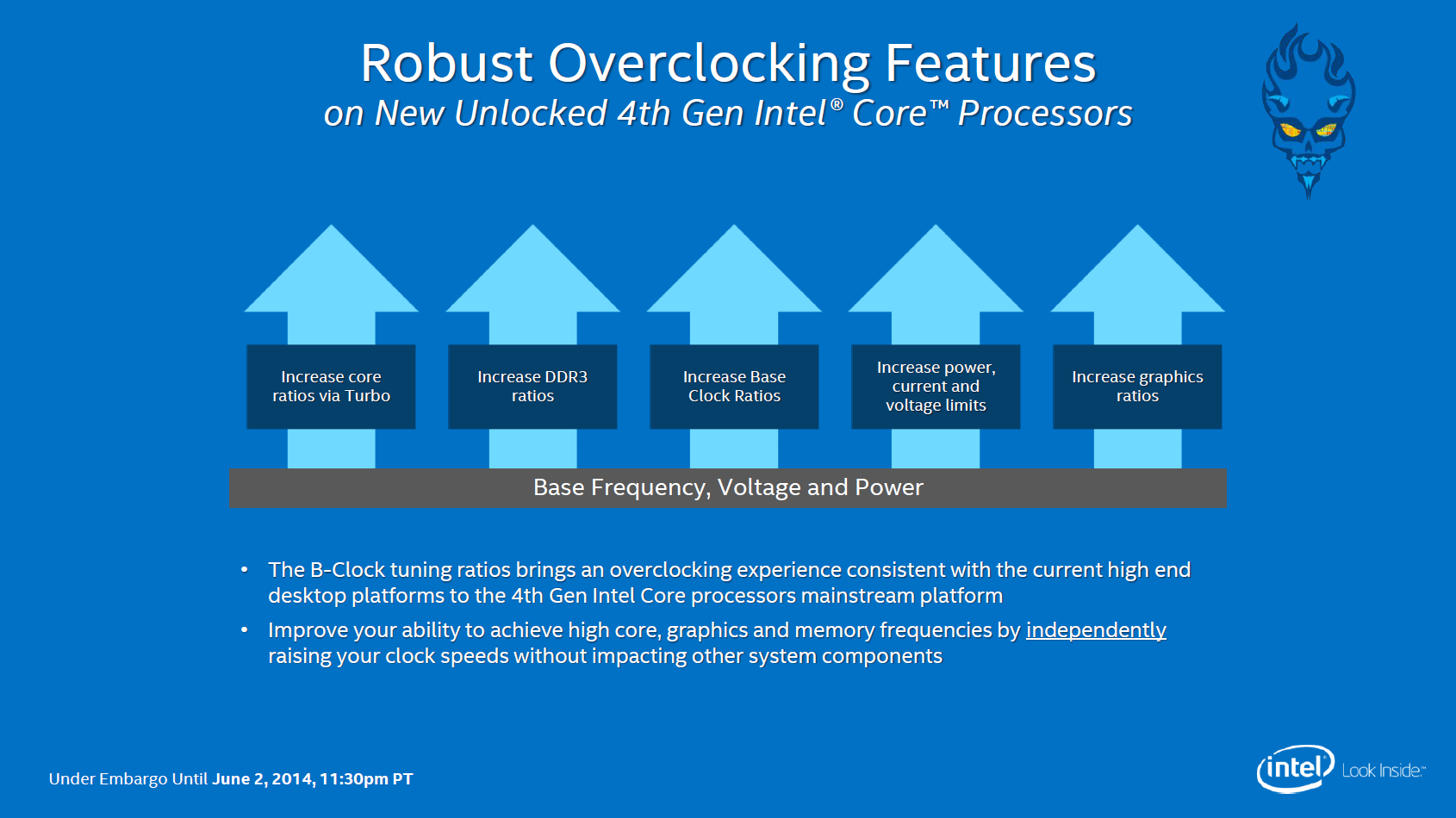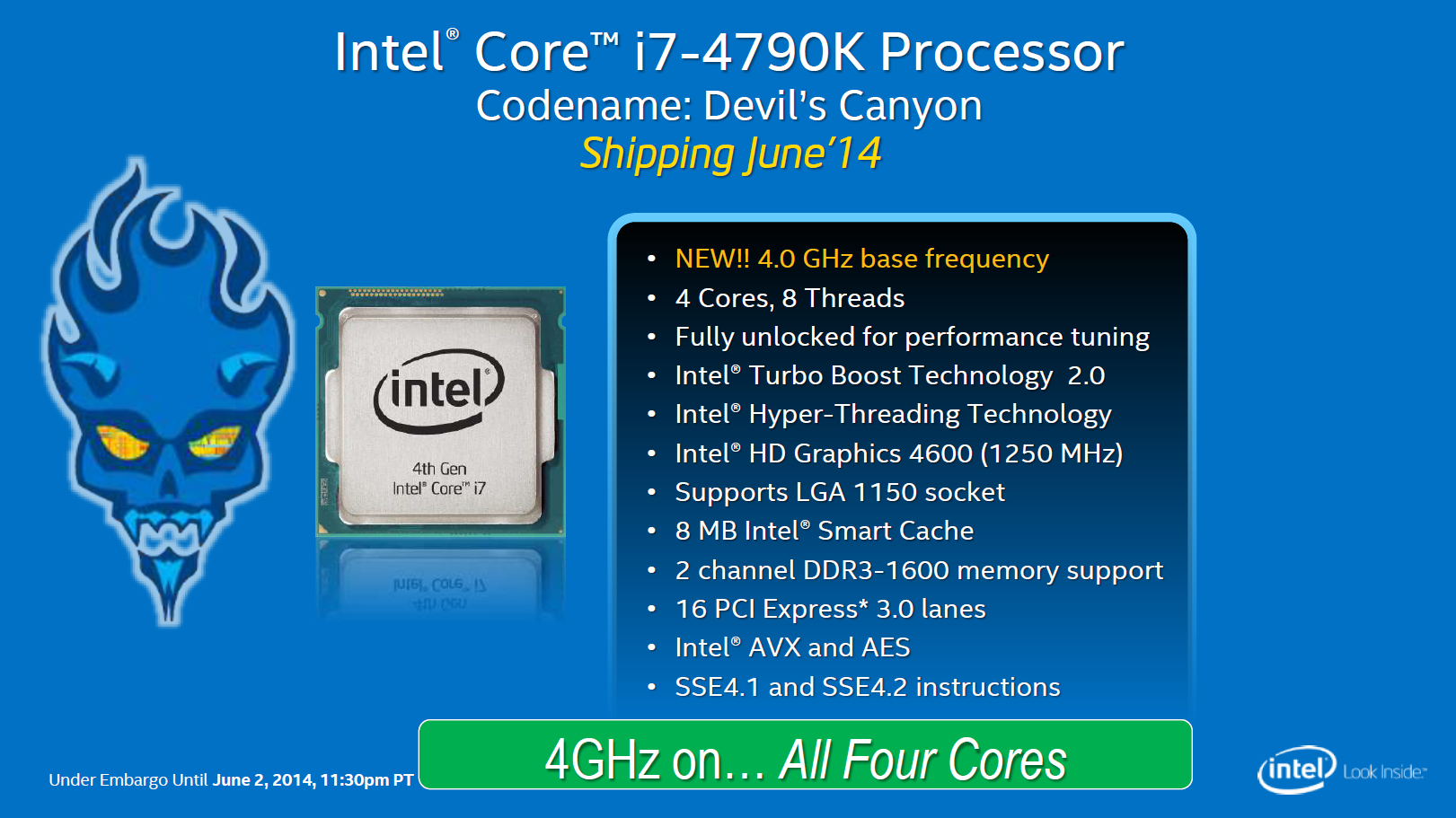 Today Intel is announcing its Devil’s Canyon series of Haswell Refresh processors aimed at enthusiasts and overclockers. There are two models in this refresh a Core i7 SKU and a Core i5 SKU, and a third Pentium SKU that isn’t technically a Devil’s Canyon chip but it launching at the same time and aimed at the same market. The Core i7-4790K is on its face a mildly clock bumped version of last years i7-4770K and the same is true of its i5-4690K counter part. But the devil is in the details and that where these chips get really interesting.