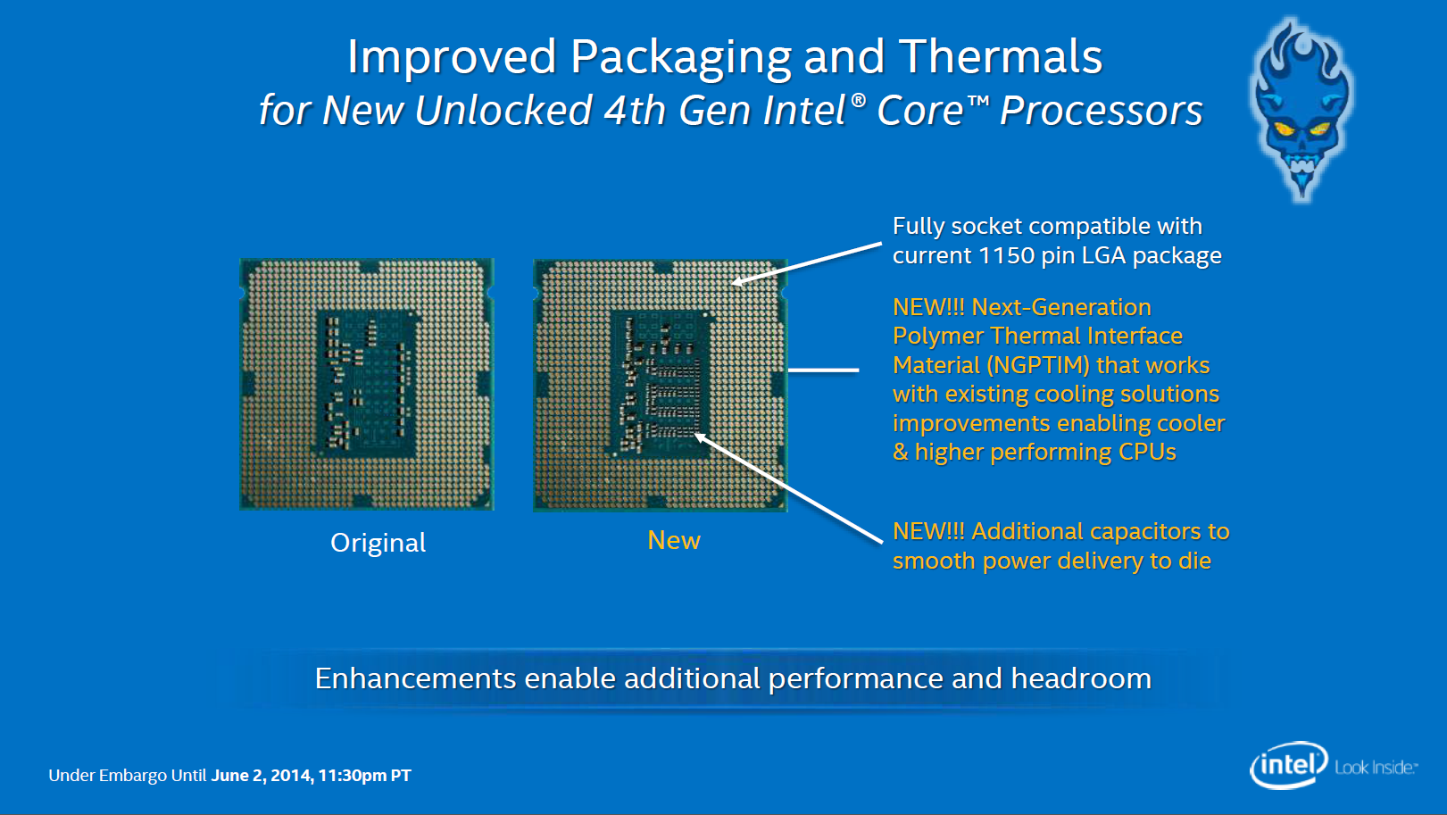 But perhaps the biggest difference between a vanilla Haswell chip and a Devil’s Canyon chip is the additional power circuitry that Intel’s engineers have installed on the under side of the chip package to enable both cleaner and higher volume power delivery. For hobbyist overclocks these changes are a godsend coming off the heels of an otherwise disappointing period of mediocre Haswell overclocking.