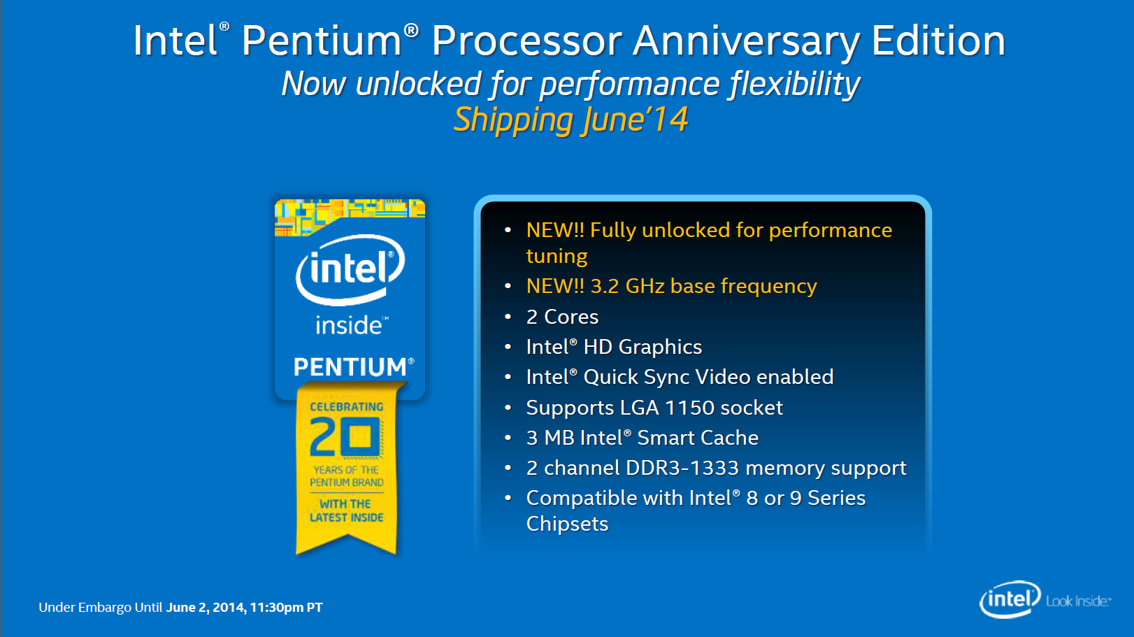 By far my personal favorite chip of this launch cycle is Intel’s Pentium Anniversary Edition. It’s a dual core Pentium branded and heavily binned Haswell chip should retail for less than $100 and offer an unlocked clock multiplier. Long gone are the days when you could buy a cheap Intel CPU and then clock it to the moon to get i7-like performance levels with out the cost. And while Intel has disabled so much of this chip that it will likely never challenge it’s i7 or even i5 chips when overclocked, it still looks to be an excellent proposition for budget gaming builds where single core performance per dollar is more important than any other metric.